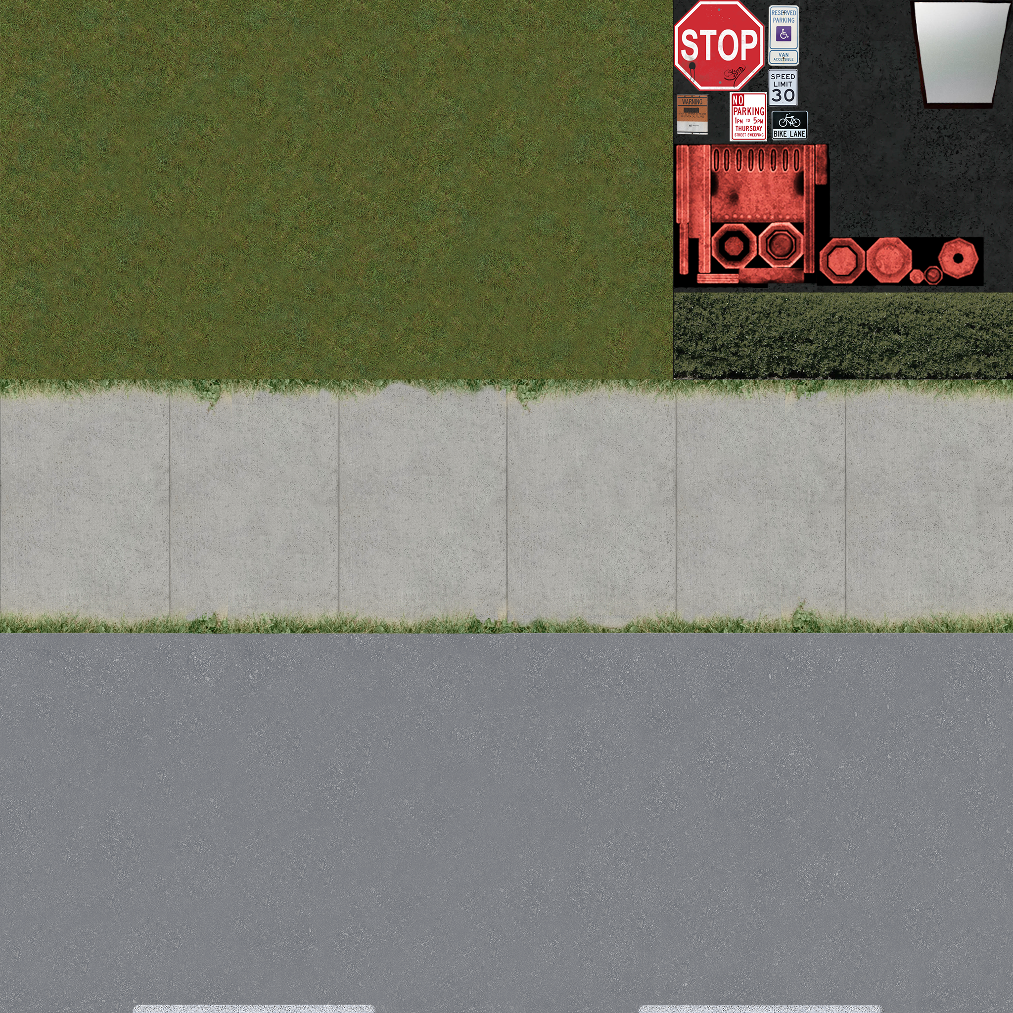 Work: Bridges, flood control, metal railings, concrete walls, foliage, vista card. Small props and buildings were made by another artist and were optimized by me to meet desired tri and material count.